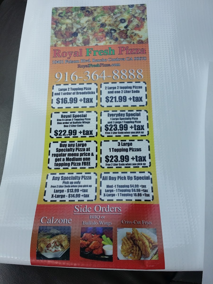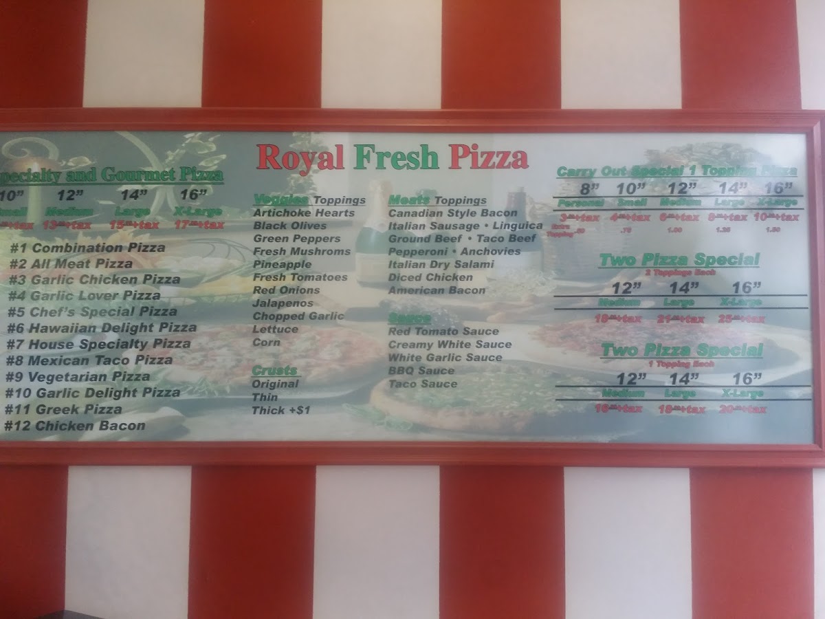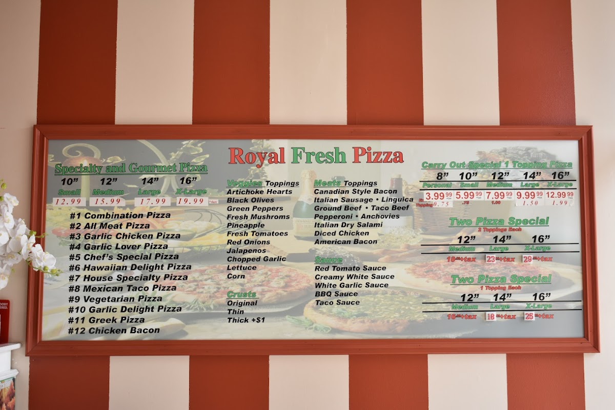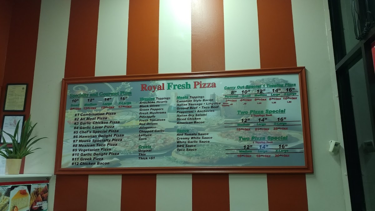 The menu at Royal Fresh Pizza offers a wide variety of options to suit every craving. Their Specialty Pizzas stand out, with flavorful choices like Chef's Special, Garlic Delight, and Garlic Chicken, each crafted with unique combinations of toppings. For a smoky kick, the BBQ Chicken and Chipotle Chicken pizzas are perfect. The menu also includes classic options like the 1 Topping Pizza, 2 Topping Pizza, and 3 Topping Pizza, allowing for customizable choices. Royal Fresh Pizza has great Hot Deals that offer excellent value, such as 3 Large 1 Topping Pizzas + 2L Soda and 2 Large 2 Topping Pizzas + 2L Soda, ideal for sharing. Other deals like the XL-2 Topping Pizza + 8 BW Wings + 2L Soda and Large 2 Topping + Cheesy Bread (12 Pcs) provide tasty combinations for every occasion. On the side, guests can enjoy items like BBQ Wings (10), Chicken Strips, and Chicken Bacon Penne Pasta, perfect for satisfying hunger. Criss Cut Fries and Buffalo Wings (10) also make for great sides. To quench your thirst, a 2 Liter Soda is available to complete your meal. The menu at Royal Fresh Pizza is both diverse and delicious, offering something for everyone at great prices.