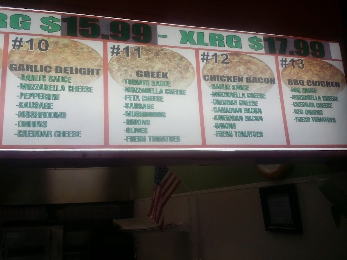 Garlic white sauce, mozzarella cheese, ham, american bacon, onions, chicken, tomatoes, cheddar cheese